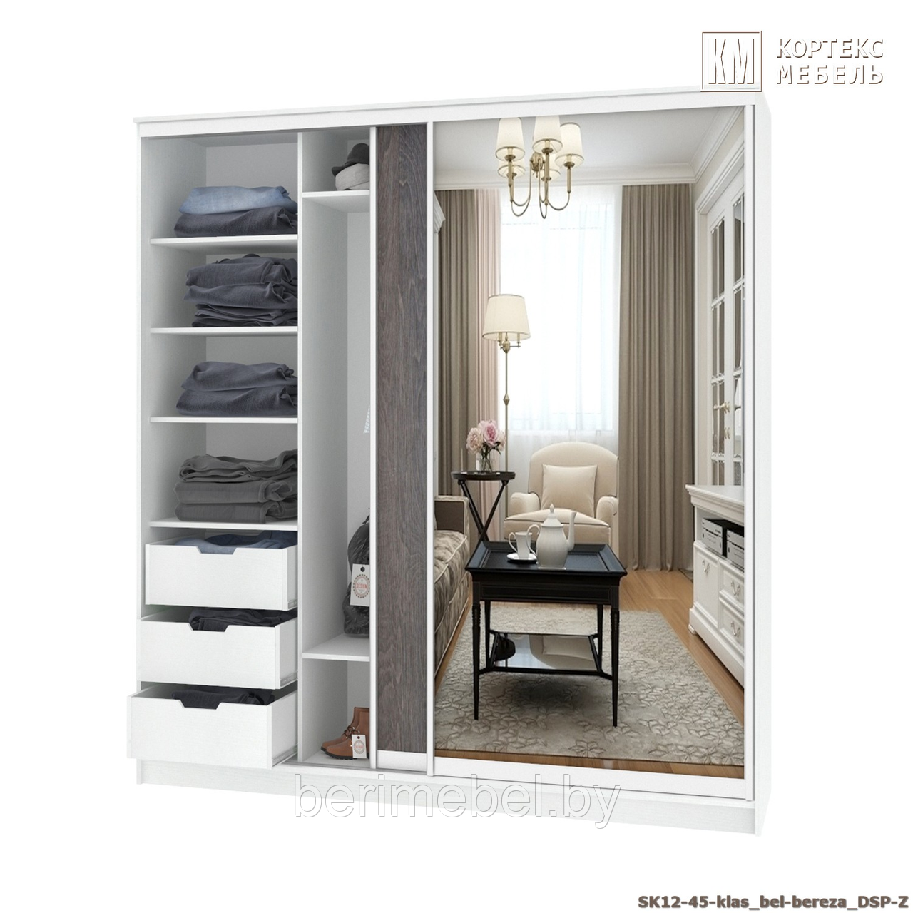 Шкаф-купе Сенатор ШК12-45 (гл.450мм.) (2,05М) классика, ДСП+Зеркало, Белый/Берёза КОРТЕКС