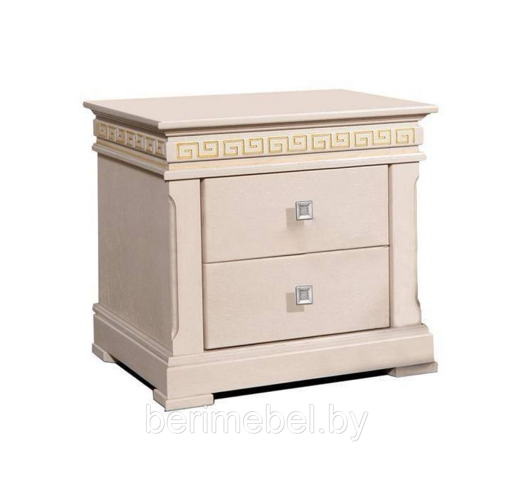 Тумба прикроватная Фелиция 3М — удобный элемент в пространство спальной комнаты, выполнен в неоклассическом стиле. Изделие в величественном дизайне представлено конструкцией с цокольным основанием на опорах, верхней крышкой с фрезеровкой по дереву с геометрическим орнаментом, эксклюзивной фурнитурой и нежном оттенке "Бело-розовая эмаль с золотой патиной". Модуль изготовлен из натурального дерева — массива дуба. Защитная отделка поверхности производилась защитным акриловым лаком, безопасным для здоровья человека. Система хранения представлена двумя выдвижными ящиками, где можно хранить необходимые вещи под рукой: книги, журналы, часы, очки и пр. Гарнитур гармонично смотрится рядом с кроватью Фелиция 2М как попарно, так и в единичном исполнении.
