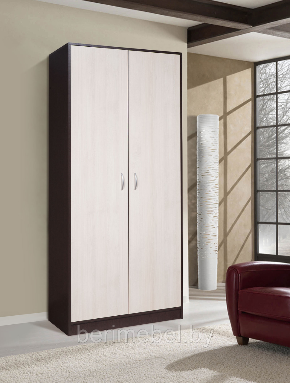 Шкаф МЕБЕЛЬ-КЛАСС Мэдисон-М Венге /Ясень шимо светлый 90х58х210 см — удобный, компактный, но вместительный шкаф для одежды. Левая половина шкафа оборудована штангой для одежды и антресольной полкой, правая половина — полками. Удобная классическая конструкция шкафа с распашными дверями позволяет бережно заботиться о своем гардеробе и быстро находить нужную вещь. Материал: каркас/фасад – ламинированная ДСП, кромка - ПВХ 0,45 мм, ручки – металл.